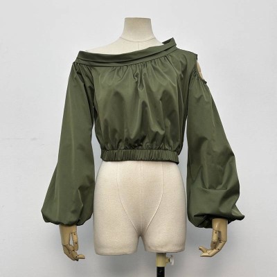 Elegant Army Green Off-the-Shoulder Cropped Lantern Sleeve Top