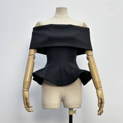 Black Off-the-Shoulder Waist-Cinched Short Top Slim Fit Strapless Style Top