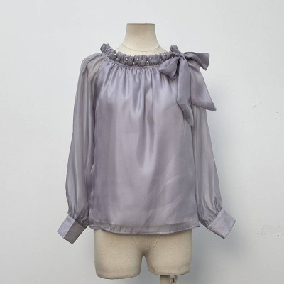 Elegant Gray-purple Off-shoulder Lace-up Chiffon Shirt Temperament Long-sleeve Loose Top