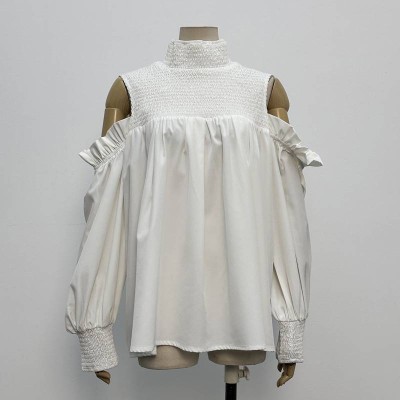 White Turtleneck Cold-Shoulder Ruffle Loose Long Sleeve Blouse
