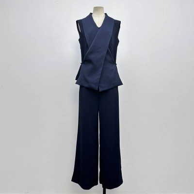 Navy Sleeveless V-neck Waist-cinching Top & Wide-leg Pants Fashion Set