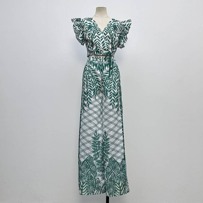 Vintage Green Leaf Print V-neck Ruffle Cropped Top & Wide-leg Pants Set