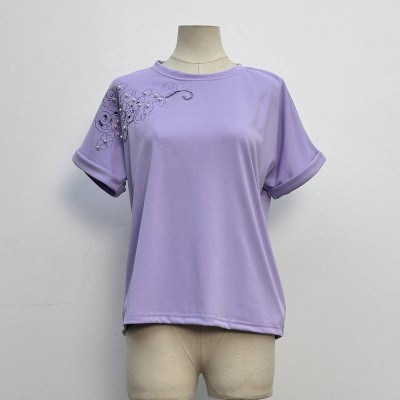 Purple Embroidered Pearl Decorated Crew Neck Short Sleeve T-shirt Loose Casual Top