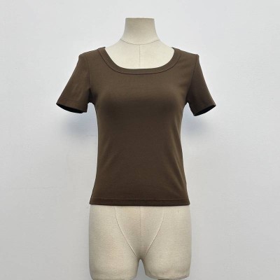 Simple Brown Square Neck Short Sleeve Slim Fit T-shirt