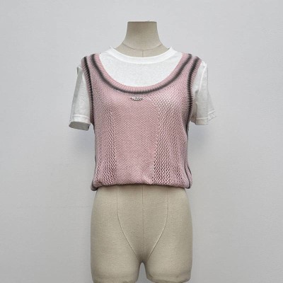 Two-in-one Crew Neck Knitted Vest with Short Sleeve T-shirt, Gentle Style Pink Hollow Out Top