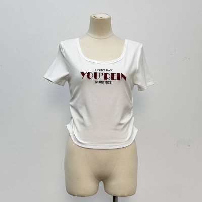 White Square Neck Letter Print Short Sleeve Cropped T-shirt Slim Fit Basic Top