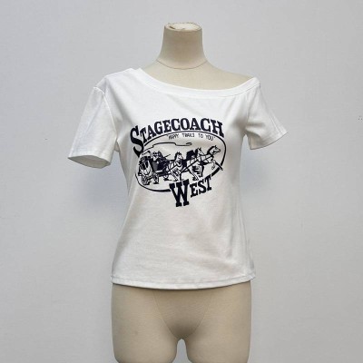 Vintage Off-the-shoulder Short-sleeve T-shirt Casual Letter Print Top