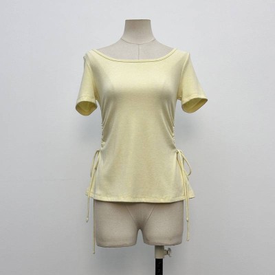 Milk Yellow Side Drawstring Short Sleeve T-shirt Slim Fit Boat Neck Top