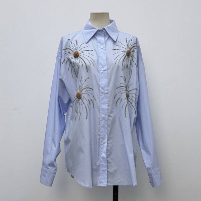 Light Blue Firework Bead Embellished Lapel Long Sleeve Shirt