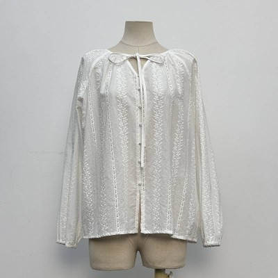 White Embroidered Tie-neck Long-sleeve Shirt Literary Style Hollow Embroidery Loose Top