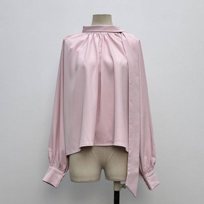 Gentle Pink Satin Ribbon Shirt Elegant Long-sleeve Stand Collar Top