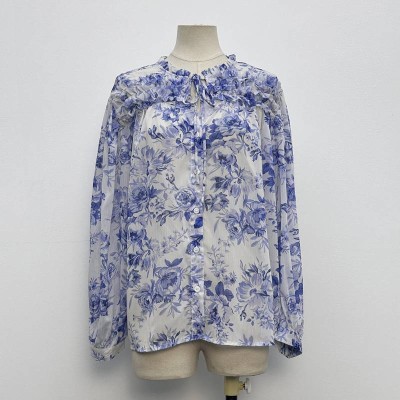 Blue White Floral Tie Neck Chiffon Long Sleeve Blouse