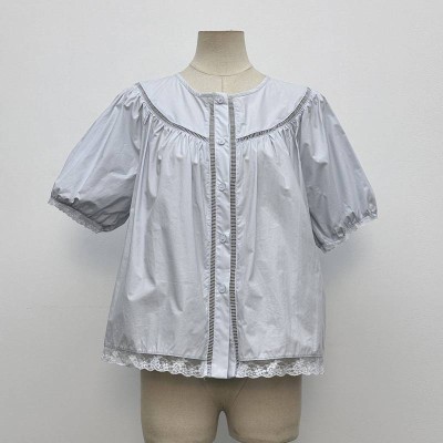 Light Gray Round Neck Puff Sleeve Lace Trim Shirt Loose Age-reducing Short-sleeve Top