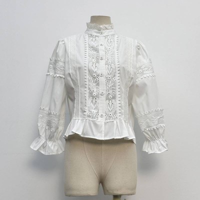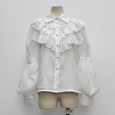 French Court Style Ruffled Beaded White Shirt Lantern Sleeve Temperament Long Sleeve Top