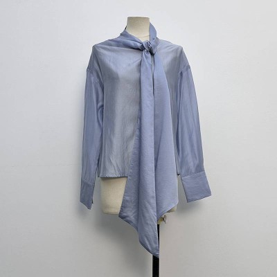 Elegant Ribbon Design Long Sleeve Shirt Niche Chic Loose Slim Blue Top