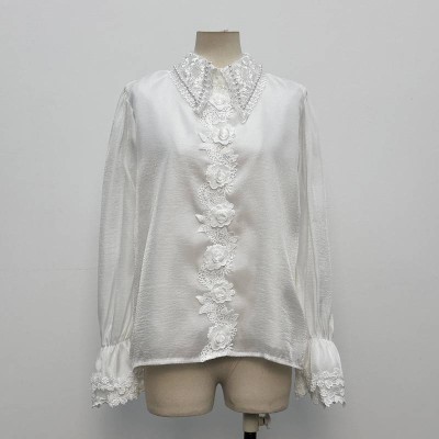French Lace Pearl Lapel Long Sleeve Shirt 3D Floral Elegant White Blouse