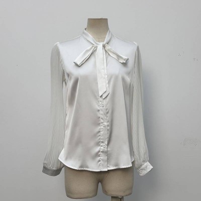 White Satin Tie-neck Long Sleeve Shirt Elegant Office Style Top