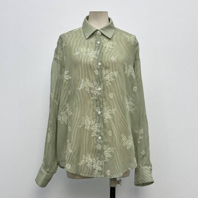 Green Striped Floral Sheer Long Sleeve Shirt