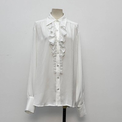 White Long-sleeved Shirt with Vertical Stripes and Ruffles, Elegant Commuter Top