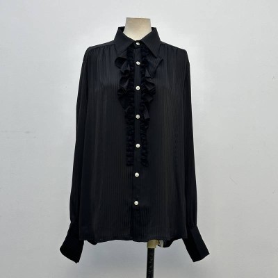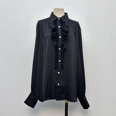Black Vertical Stripe Ruffle Lapel Long Sleeve Shirt Elegant Commuter Versatile Blouse