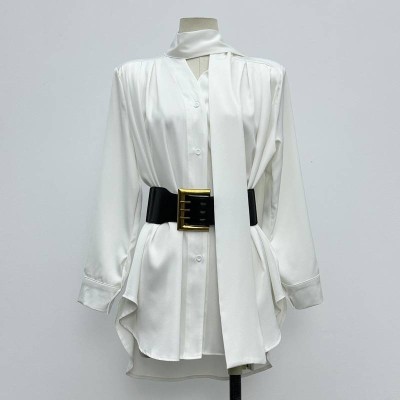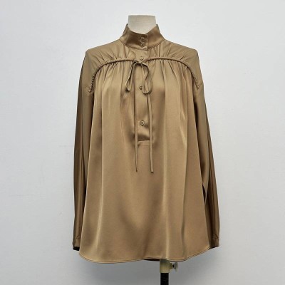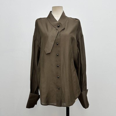 Satin Stand-Up Collar Tie Long-Sleeve Shirt Temperament Commute Loose Slim Solid Color Top