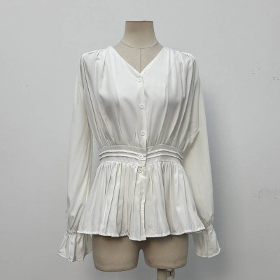 V-neck Waist-cinching Long-sleeved White Satin Shirt Elegant Commuting Ruffled Slim-fit Blouse