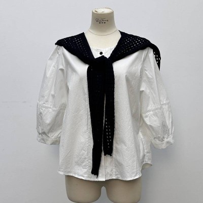 Elegant White 3/4 Sleeve Shirt with Black Knitted Shawl Casual Commuting Versatile Top