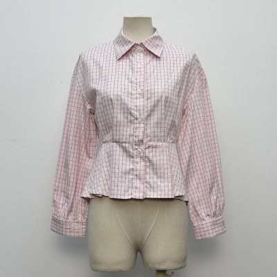 Pink Plaid Waist-cinched Long-sleeve Shirt Vintage Lapel Slim Top