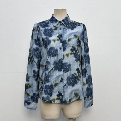 Vintage Blue Floral Print Long Sleeve Lapel Shirt