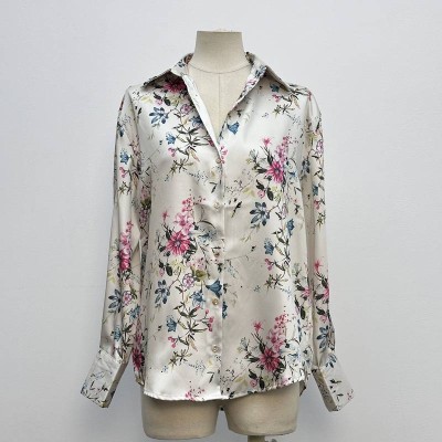 Elegant Floral Print Satin Long-sleeve Shirt Lapel Single-breasted Commute Top
