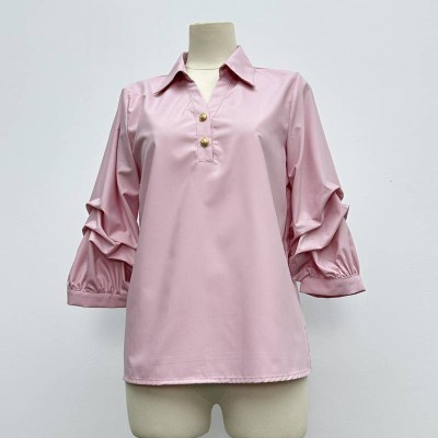 Pink Lapel Pleated 3/4 Sleeve Shirt Elegant Simple Pullover Top