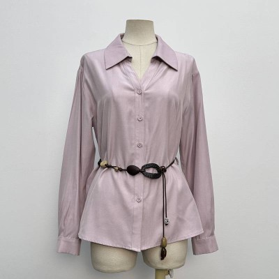 Elegant V-neck Light Purple Long-sleeve Shirt Waist-tie Design Top