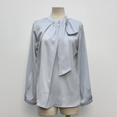 Elegant Bow Tie Stand Collar Shirt Simple Long Sleeve Satin Blouse