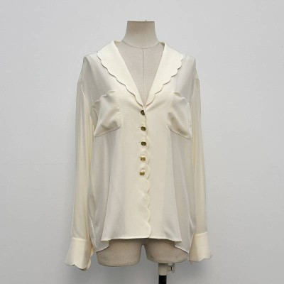 French Satin Wave Edge V-neck Shirt Elegant Loose Long-sleeve Top