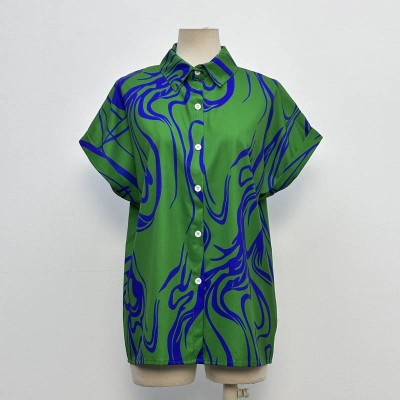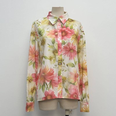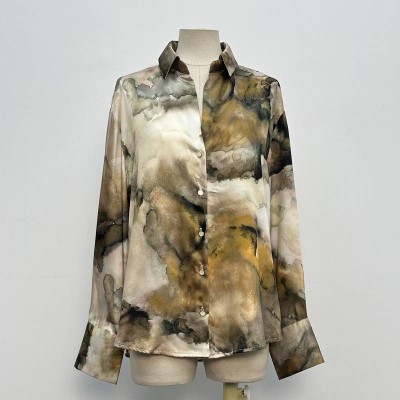 Watercolor Print Lapel Long Sleeve Shirt Elegant Commute Satin Blouse