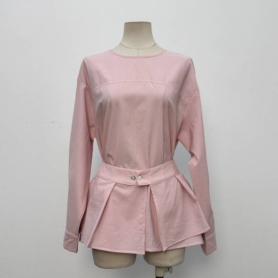 Pink Crew Neck Long Sleeve Waist Cinched Shirt Niche Design Slit Hem Top