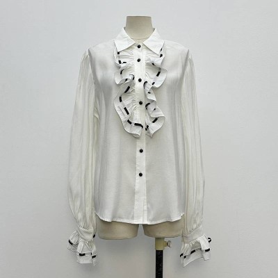 Color Block Ruffle Collar Long Sleeve Shirt Elegant Commute White Blouse