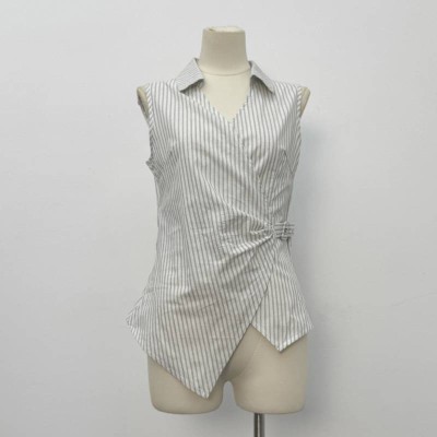 Striped Lapel Sleeveless Waist Cinched Irregular Hem Shirt