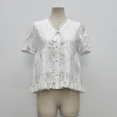 French Lace V-neck Puff Short Sleeve Shirt Sweet Age-reducing Loose White Top