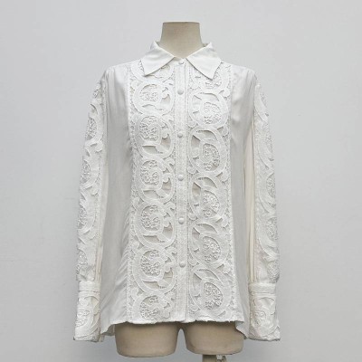 Vintage White Lace Patchwork Long Sleeve Lapel Shirt Elegant Hollow Embroidery Women's Top