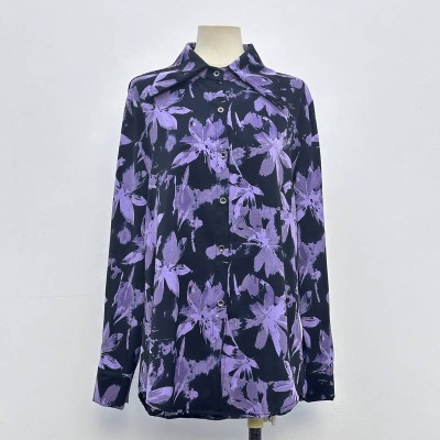Vintage Ink Purple Flower Long Sleeve Shirt Loose Lapel Print Blouse