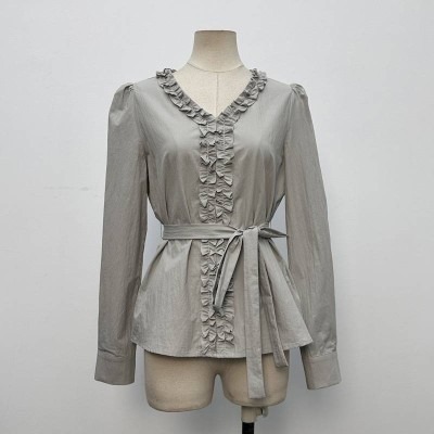 Elegant V-neck Ruffled Waist-cinched Long-sleeve Shirt Light Gray Niche Design Top