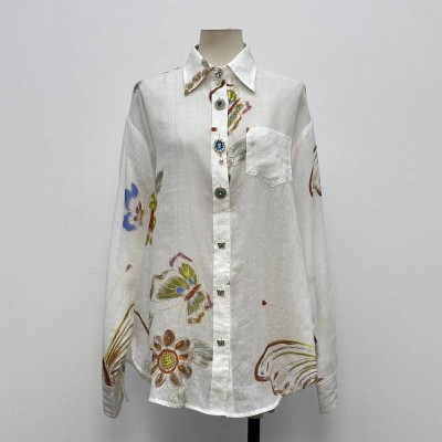 Butterfly & Floral Print Lapel Long Sleeve Shirt Loose Breathable Single-breasted Blouse