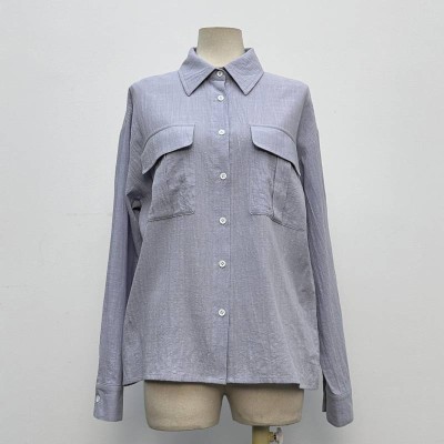 Light Gray Lapel Long Sleeve Shirt Double Pocket Casual Blouse