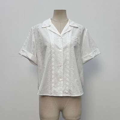 White Hollow Out Lapel Short Sleeve Shirt Loose Cropped Top