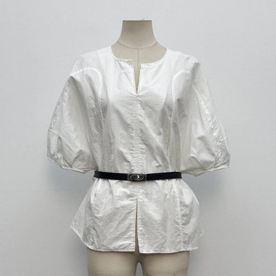 White V-neck Puff Sleeve Waist-cinching Shirt Loose Mid-sleeve Top