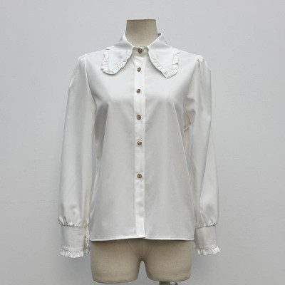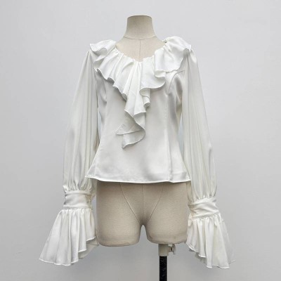 French Ruffle Satin Long Sleeve Shirt Vintage Court Style Elegant White Top