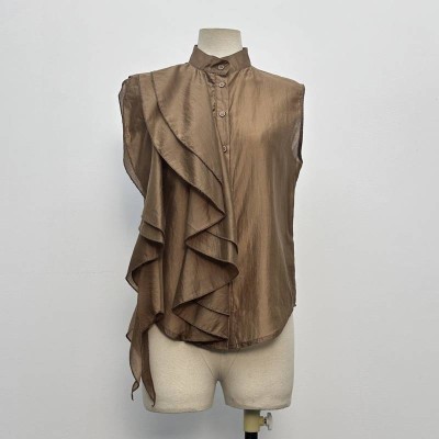 Glossy Stand Collar Ruffle Sleeveless Shirt Commute Elegant Top