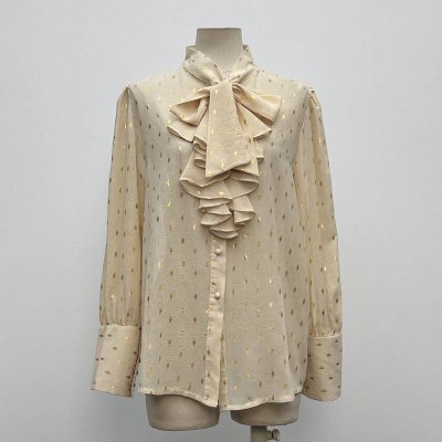 Beige Gold Foil Polka Dot Tie Ruffle Long Sleeve Blouse
