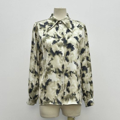 Smudge Print Lapel Long Sleeve Shirt Satin Texture Commuter Blouse